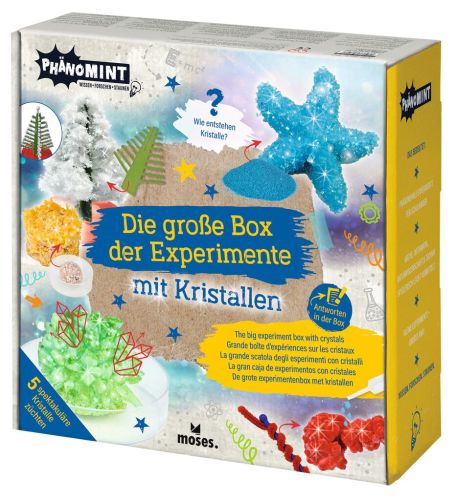 Wie entstehen Kristalle? In der großen Box der Experimente mit Kristallen warten fünf spektakuläre Versuche zum Züchten von bunten Kristallen in coolen Formen und Strukturen. Dank kindgerechter Schritt-für-Schritt-Erklärungen ist ein schneller Erfolg auch ohne Vorwissen garantiert. Am Ende laden die fertigen Kristalle in faszinierenden Strukturen dazu ein, von neugierigen Kindern bestaunt zu werden. Beim Züchten der Kristalle lernen kleine Wissenschaftler*innen außerdem ganz nebenbei, wie Kristalle und Edelsteine auch in der Natur entstehen. Kindgerechte Informationen zum wissenschaftlichen Phänomen „Kristallisation“ finden sicch hierzu im Inneren der Verpackung.
