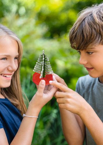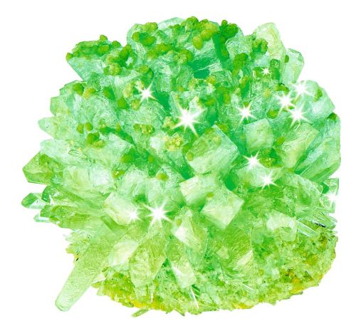 Kristallpulver, Kristallflüssigkeit, Rührstäbchen, Pfeifenputzer, Pipette, Anzuchtkegel, Anzuchtstein, 2 Dosen mit Deckel, Seestern-Anzuchtstein, Papier-Tannenbaum mit Versuchsschälchen, Versuchsanleitungen
