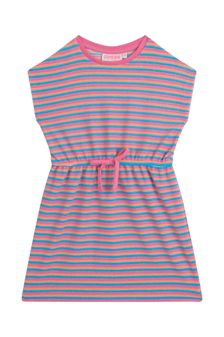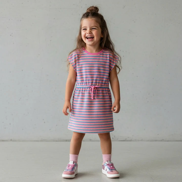 Dieses fröhliche Kleid hat dank der bunten Streifen in Rosa, Gelb, Orange und Blau sofort eine Sommeratmosphäre. Der weiche Stoff und die entspannte Passform machen sie sehr bequem zu tragen, während die kleine Taillekrawatte eine spielerische Note und eine schön geformte Silhouette verleiht. Ein echtes Wohlfühlkleid für Kinder, die Farbe und Komfort lieben.