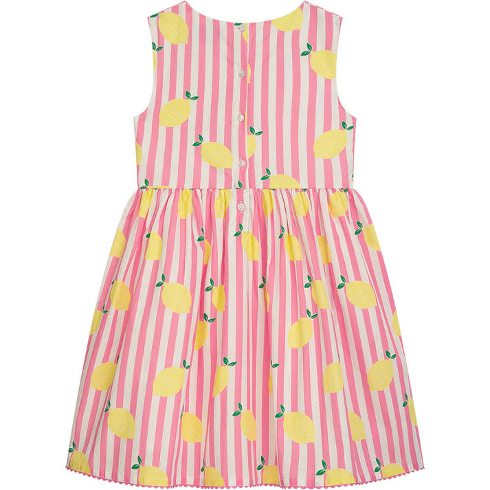Dieses ärmellose Kleid mit rosa-weißen Streifen und fröhlichem Zitronenprint bringt gute Laune in jeden Tag. Der Rundhalsausschnitt und die Schleife an der Taille sorgen für eine bequeme Passform und viel Bewegungsfreiheit